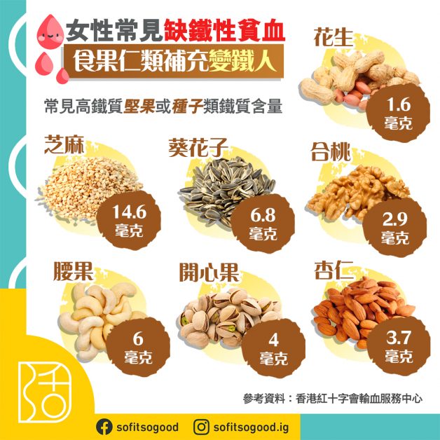 如果你經常感到疲倦、臉色蒼白、 抵抗力減弱、怕冷等,可能患有缺鐵性貧血。女性月經量高、飲食失衡、節食、食素、患出血性疾病或營養吸收不良等人,都容易患上缺鐵性貧血。其實要做「鐵人」不難,日常生活中注意補充足夠鐵質,吃果仁是一個簡單又便宜的方法。