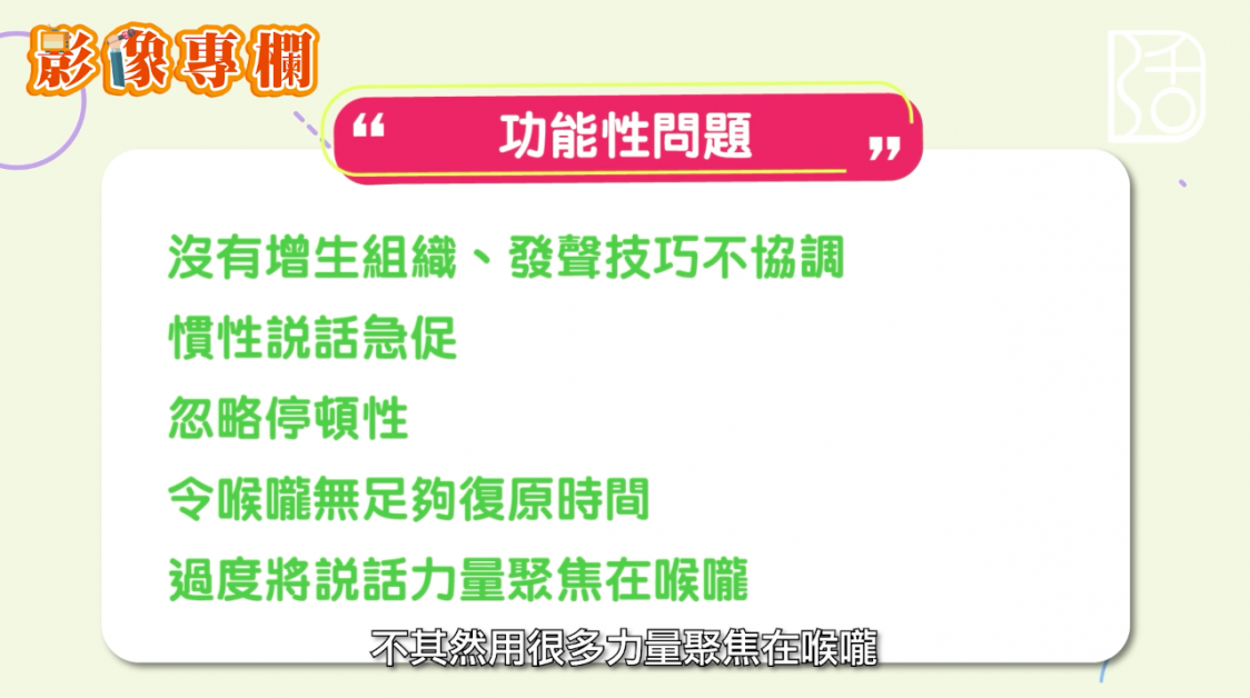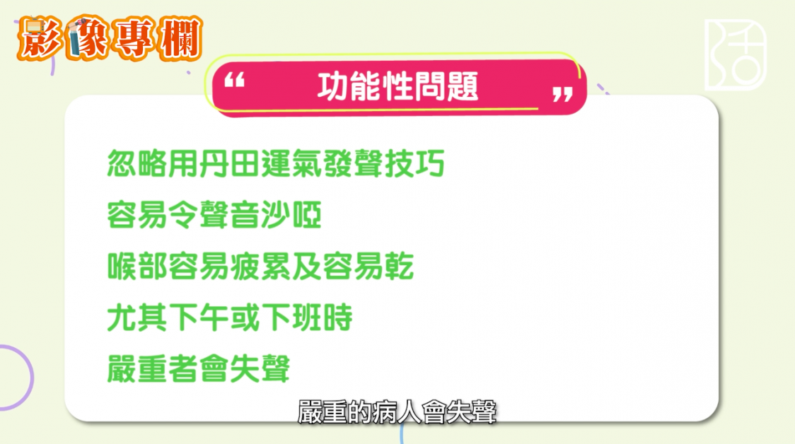 至於部分患者未必有結構異常,即沒有增生組織,但其發聲技巧出現不協調情況,都會影響到聲音質素。最常見是慣性說話急促,忽略停頓位,讓喉嚨沒有足夠時間復原,而且這種說話方式,會不其然用很力量聚焦於喉嚨,忽略用丹田運氣發聲技巧,這些均會使病人發出的聲音變得沙啞,亦令喉嚨容易累及乾,尤其是下午或下班時最為明顯,嚴重的病人甚至會失聲。
