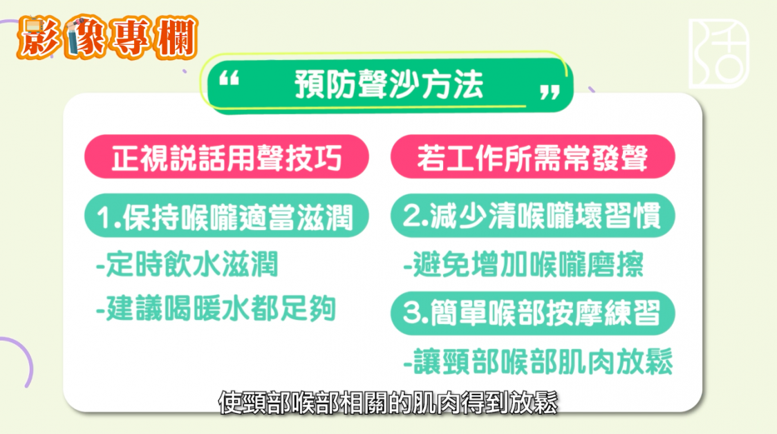 鄧醫生指出,無論是結構性或功能性問題,都是長時間發聲方法不當引致。因此要預防,便要正視說話時的用聲方法,若是工作需要經常發聲,便要謹記懂得保護喉部,最基本是保持喉嚨有適當的滋潤,他建議定時喝暖水滋潤喉嚨;其次是減少清喉嚨的壞習慣,避免增加喉嚨磨擦;第三若是需要經常說話,便謹記要有適當停頓位,以及完成一日的工作後,可以做簡單喉部按摩練習,使頸部喉部相關肌肉得以放鬆。